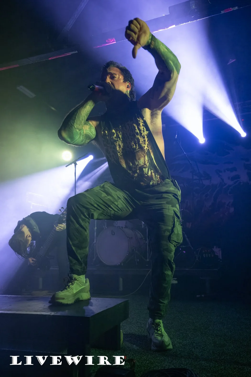 Having opened the set with The Maker from the forthcoming album the tone had been set for a brutally heavy set. This continued with Wired for Destruction from 2022’s “Bleed Abide” with its fast double bass beats driving it along like a relentless run away train, with Kyle’s intense deep guttural vocals made the speakers vibrate.