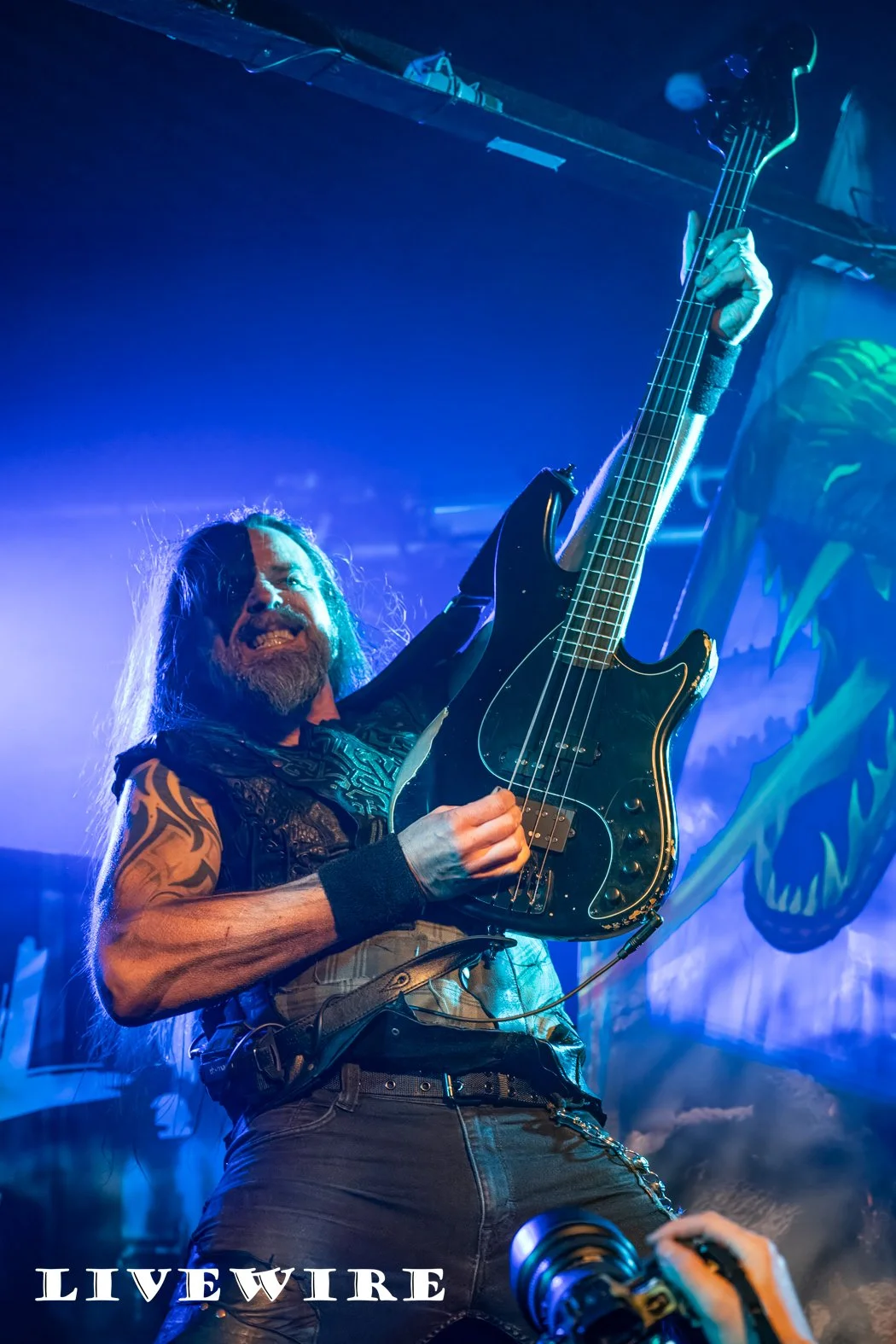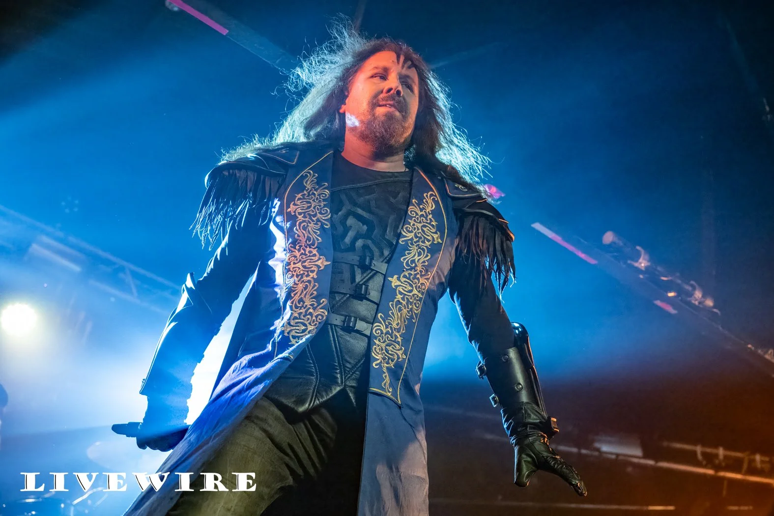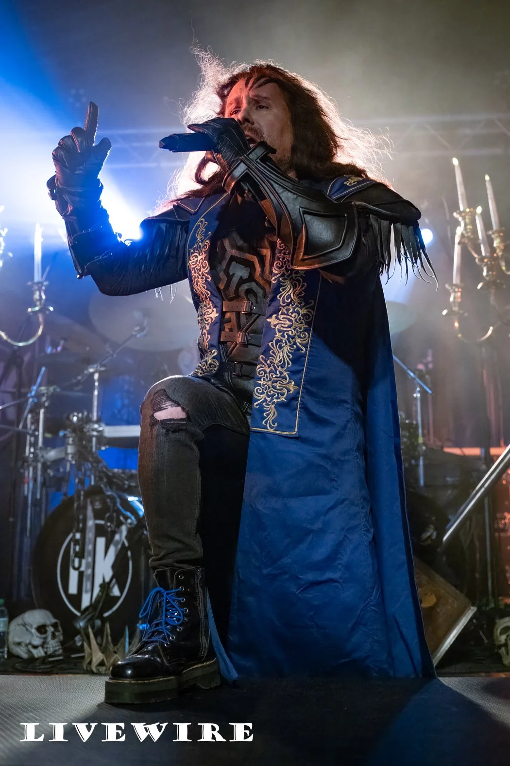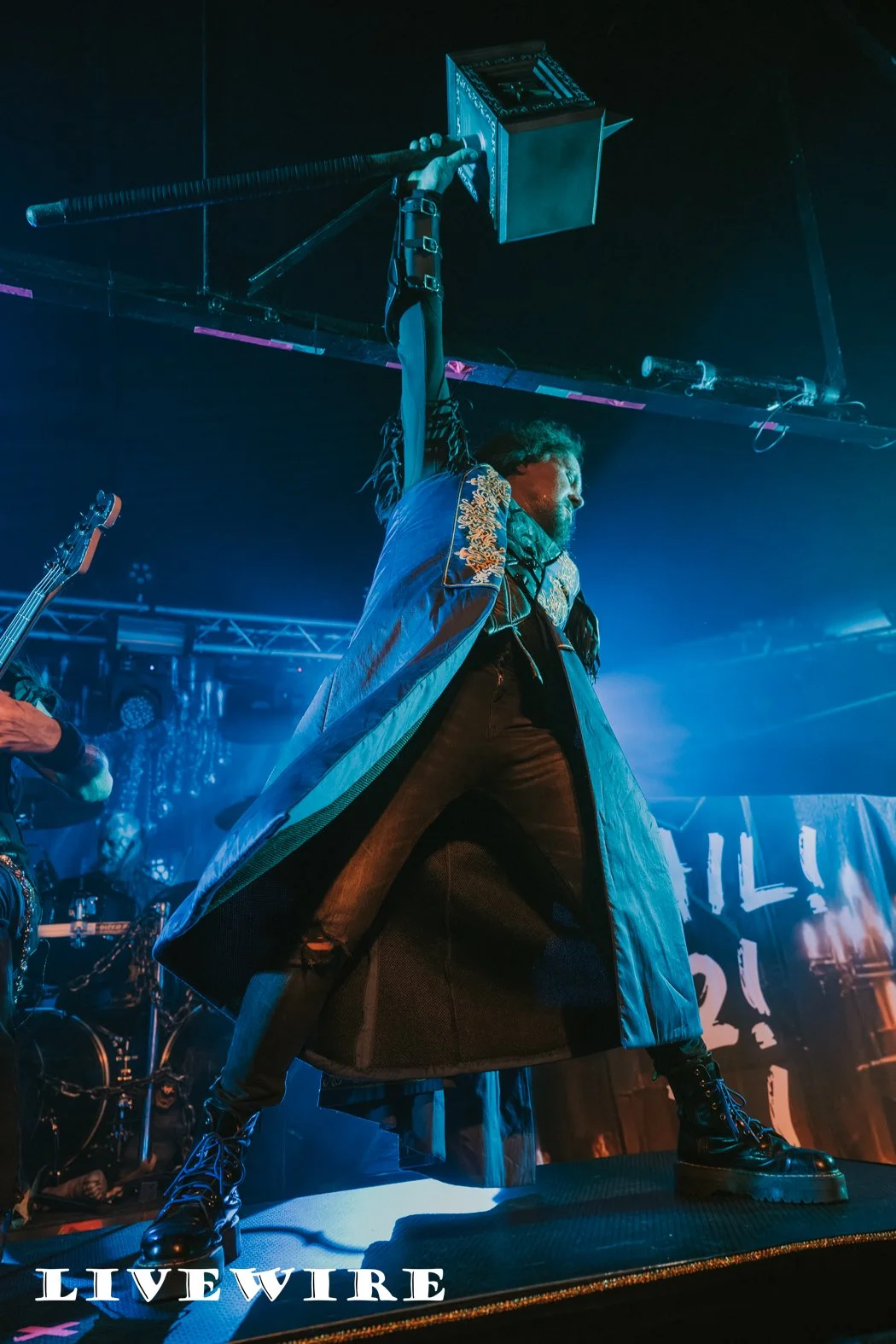 As they step on the stage, Hammer King are met with cheers from the eager Birmingham crowd, and they power into the opening track King for a Day. Lef by Titan Fox, stood atop a riser at the front of the stage, dressed in long blue gown, his size and the low gurders mean he dominates the space in front of us. It’s power metal at its finest, delivering a set wrapped around the imaginary Hammer Kingdom led by Titan Fox. The beats are fast and hard and the guitar riffs are exceptional throughout.