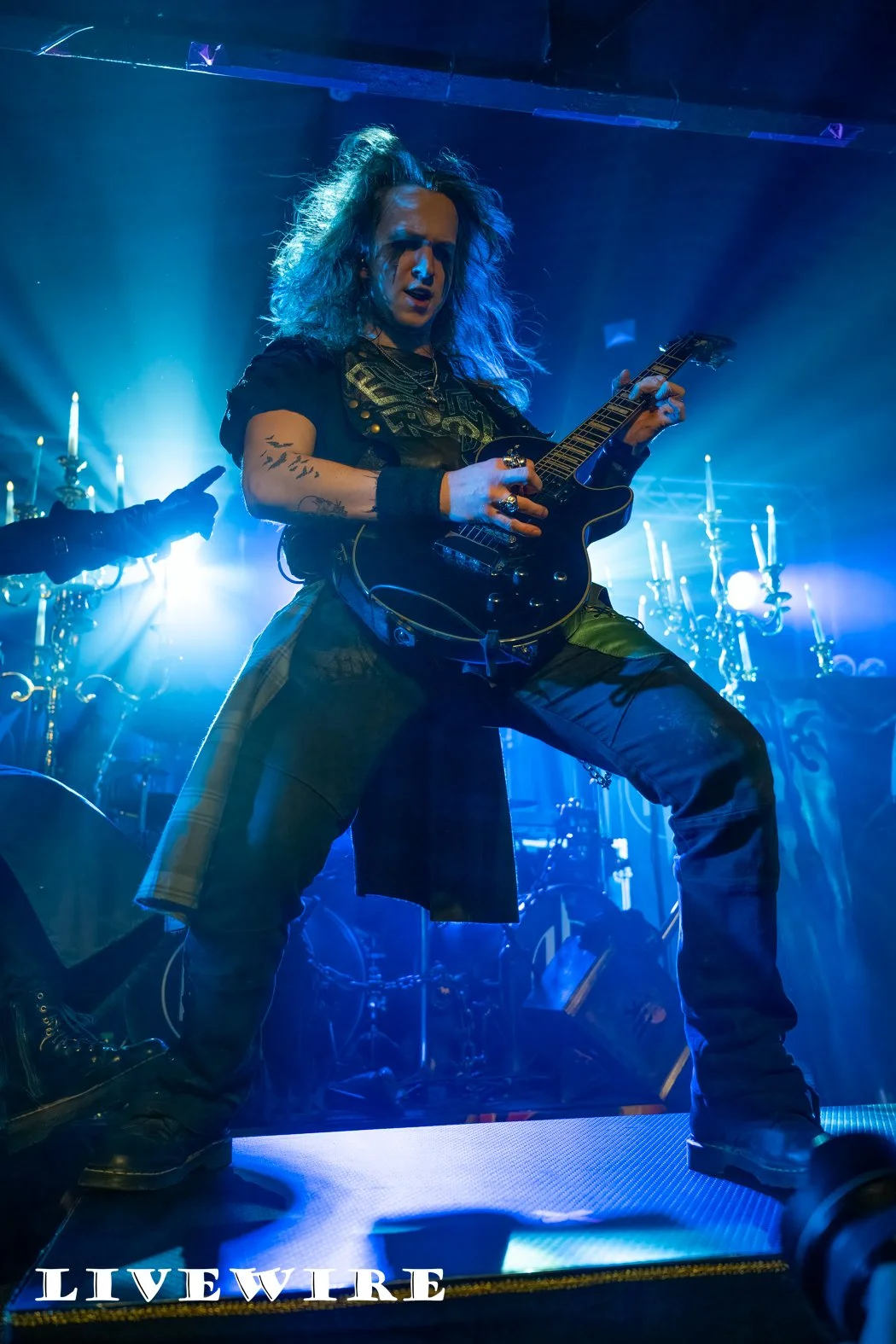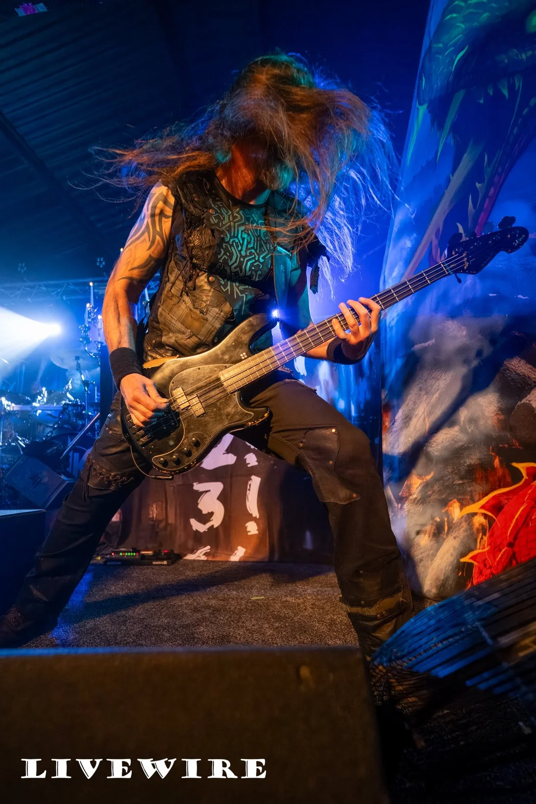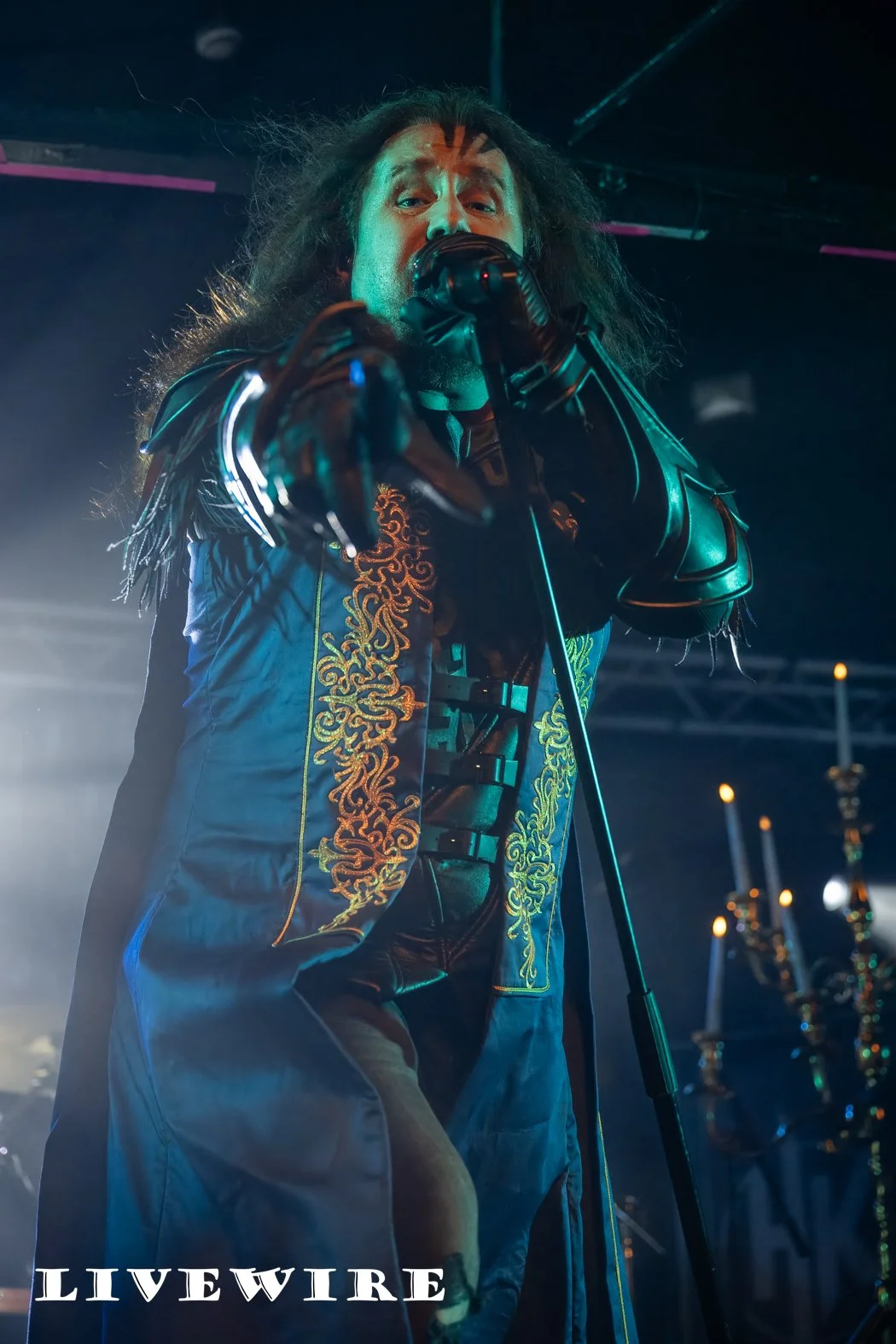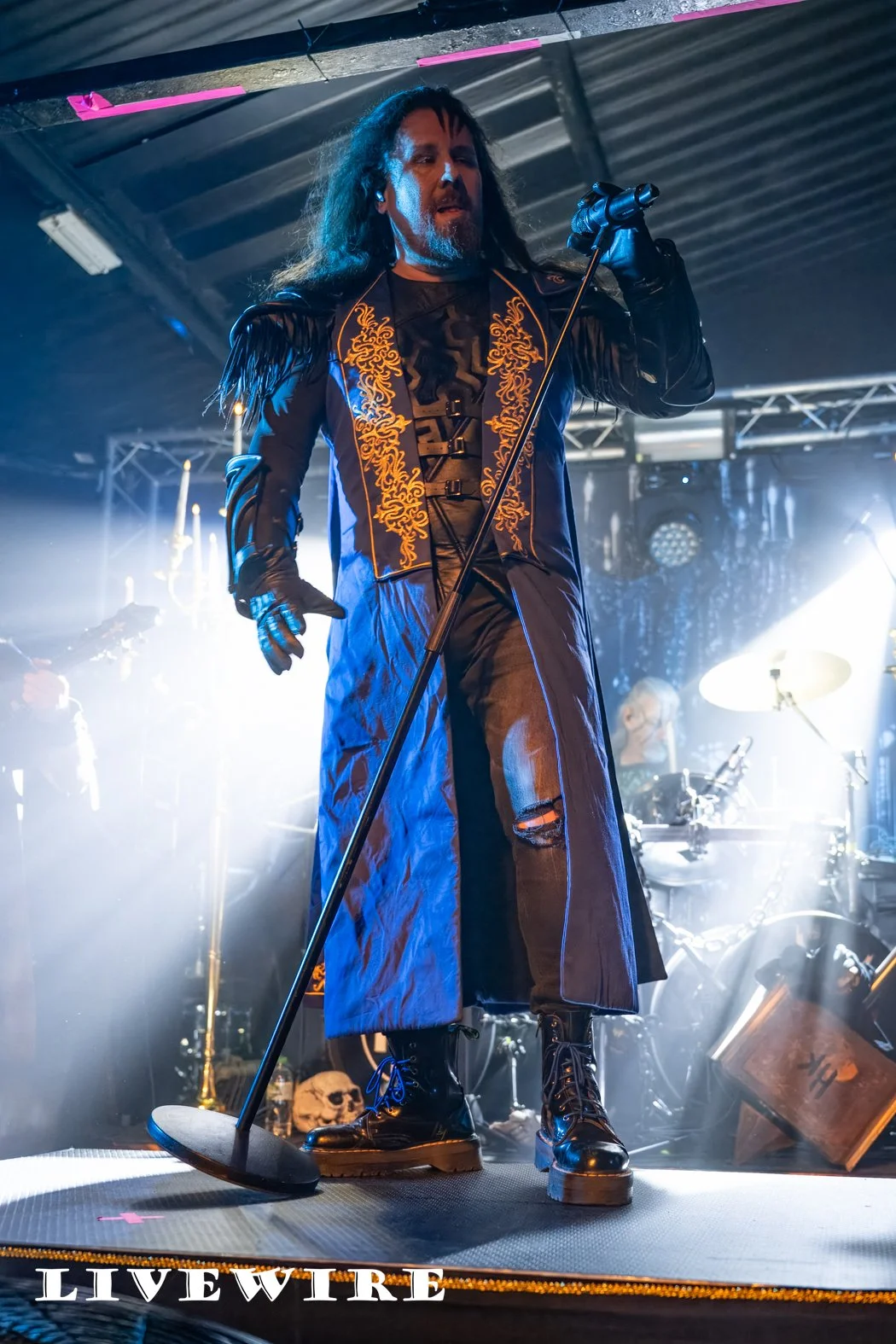 As they step on the stage, Hammer King are met with cheers from the eager Birmingham crowd, and they power into the opening track King for a Day. Lef by Titan Fox, stood atop a riser at the front of the stage, dressed in long blue gown, his size and the low gurders mean he dominates the space in front of us. It’s power metal at its finest, delivering a set wrapped around the imaginary Hammer Kingdom led by Titan Fox. The beats are fast and hard and the guitar riffs are exceptional throughout.