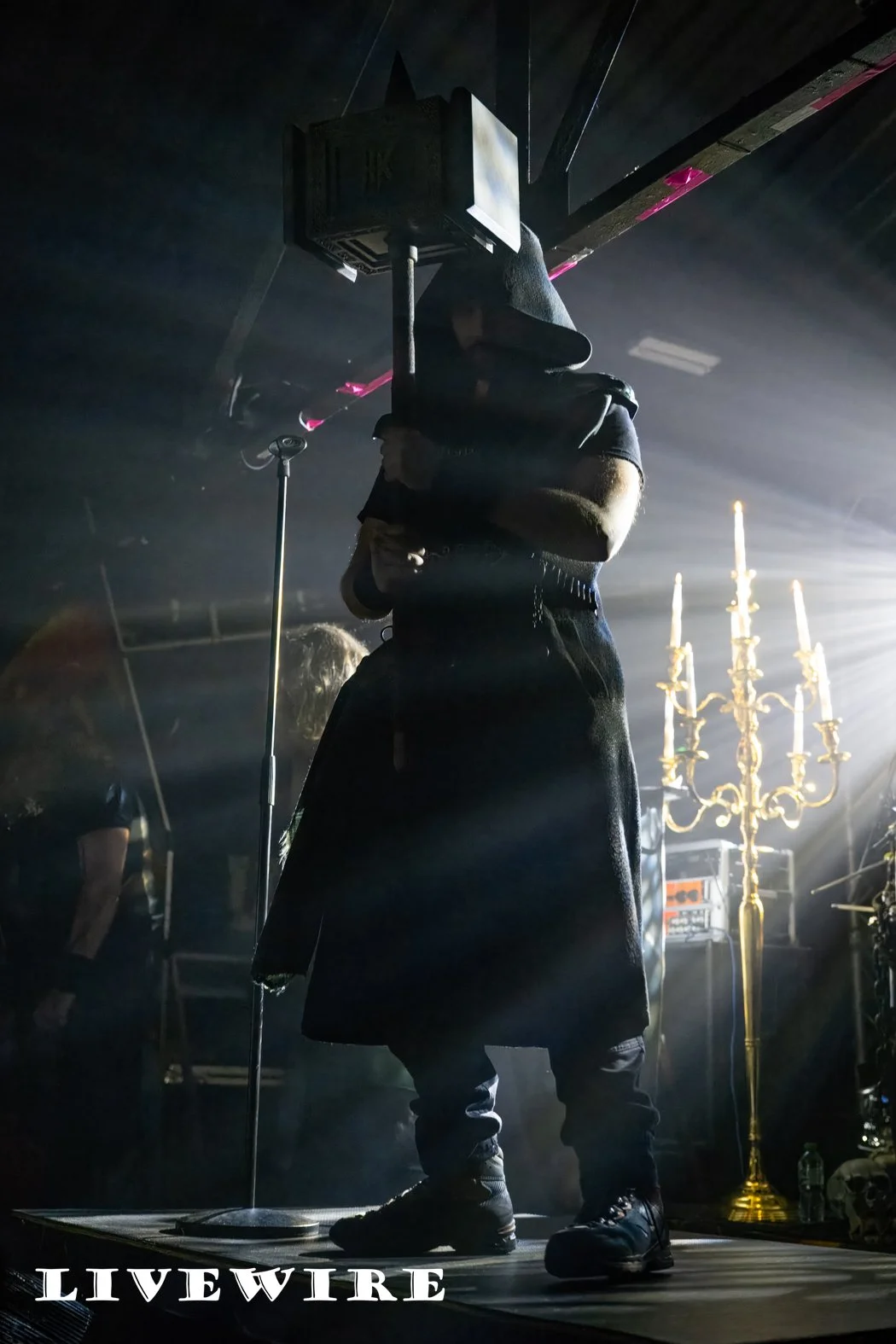 Titan King, talks to the audience between every song, expressing their joy at playing at the home of heavy metal to the crowds delight. The whole band, all with face paint play their part too, pulling poses with the guitars, and with fists raised, pumping the air at every opportunity. Through the set, the lord of the Hammer Kingdom is served a goblet by a maiden, and a hooded serf or servant brings forth the mighty power hammer (who we’re told is the only other person allowed to touch Titan Foxes’ hammer in public – ooh eer !). A mighty weapon (snigger), which Titan Fox raises high above his head in striking Masters of the Universe style.