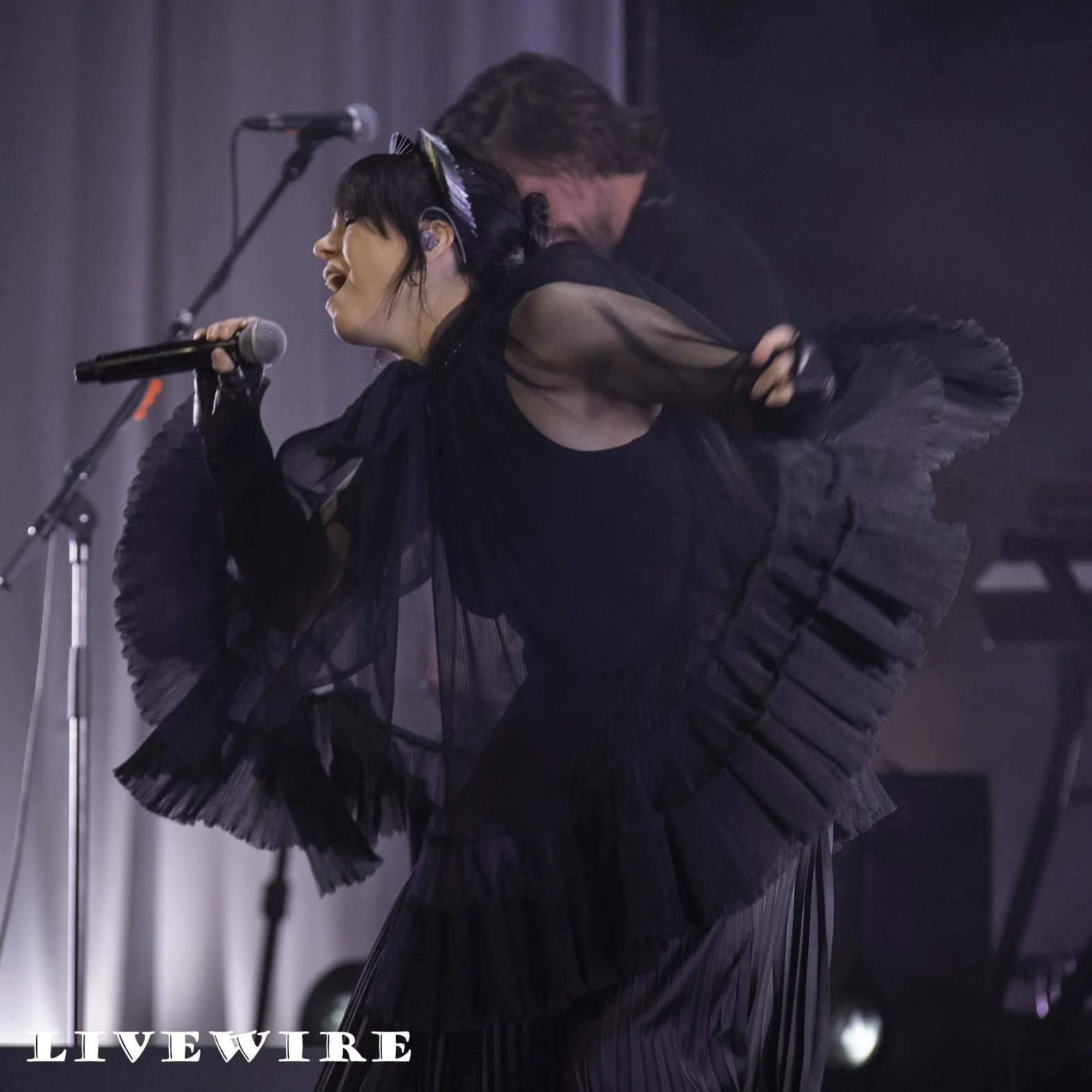 The set design works so well, in its simplicity. Simple white see through drapes over projected screens, projecting images of the moon, flowers or birds to fit the mood of the song. During one section a wonderful deep red descended with a simple, almost neon sign like outline of a woman at the back, giving a feel of a club.