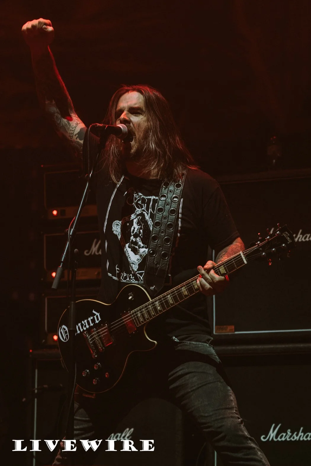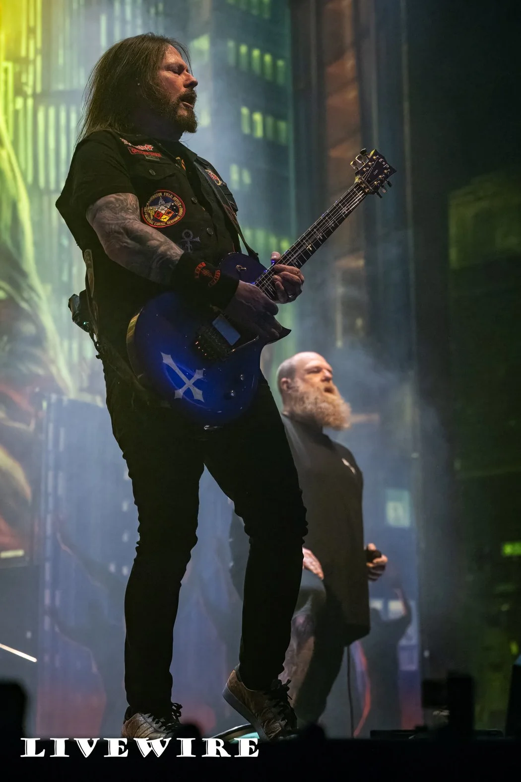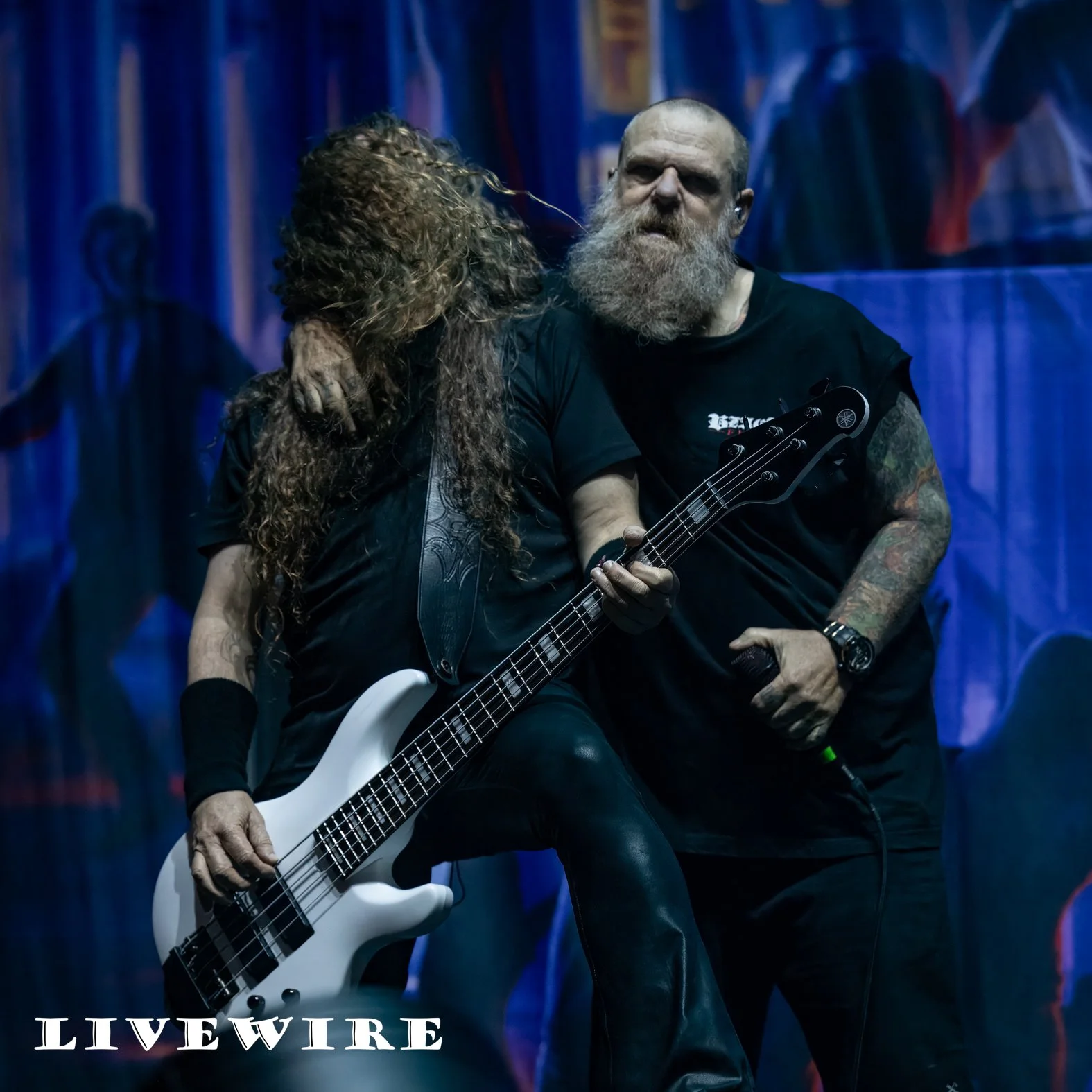 The Apollo crowd are lapping it up and singing along with passion to tracks like the icons Bonded by Bloodthe title track of their 1985 debut and it’s vinyl partner A Lesson In Violence. The pit is in full swing now and it tips over the edge as they tease a snippet of Slayer’s Raining Blood before transitioning into the magnificent The Toxic Waltz.