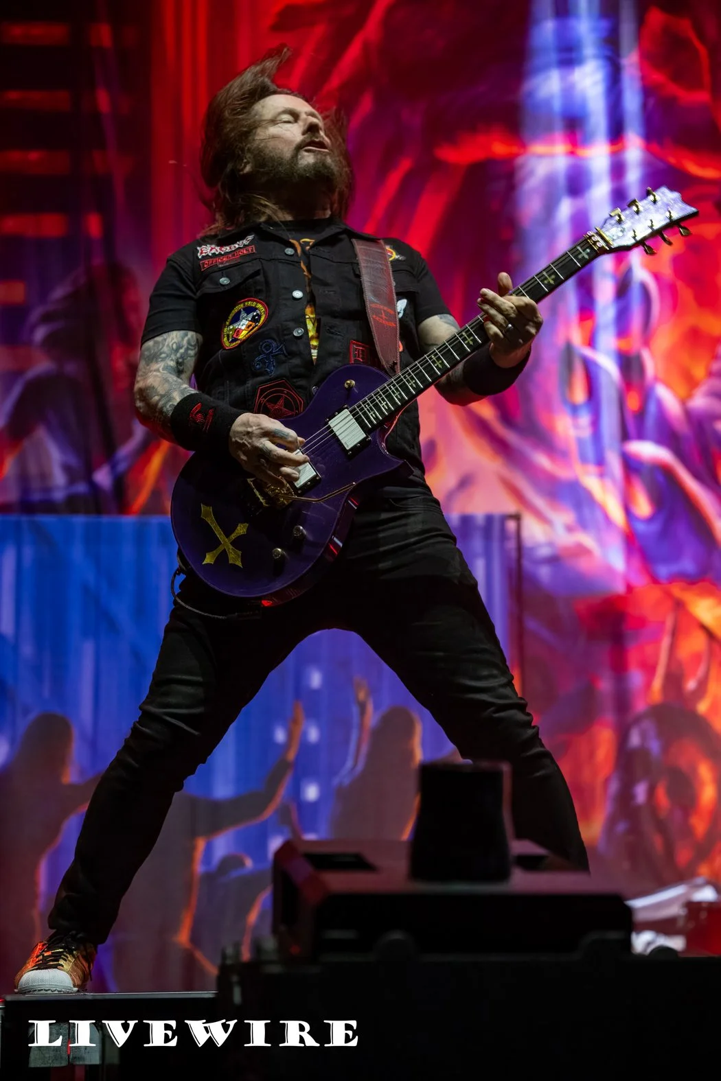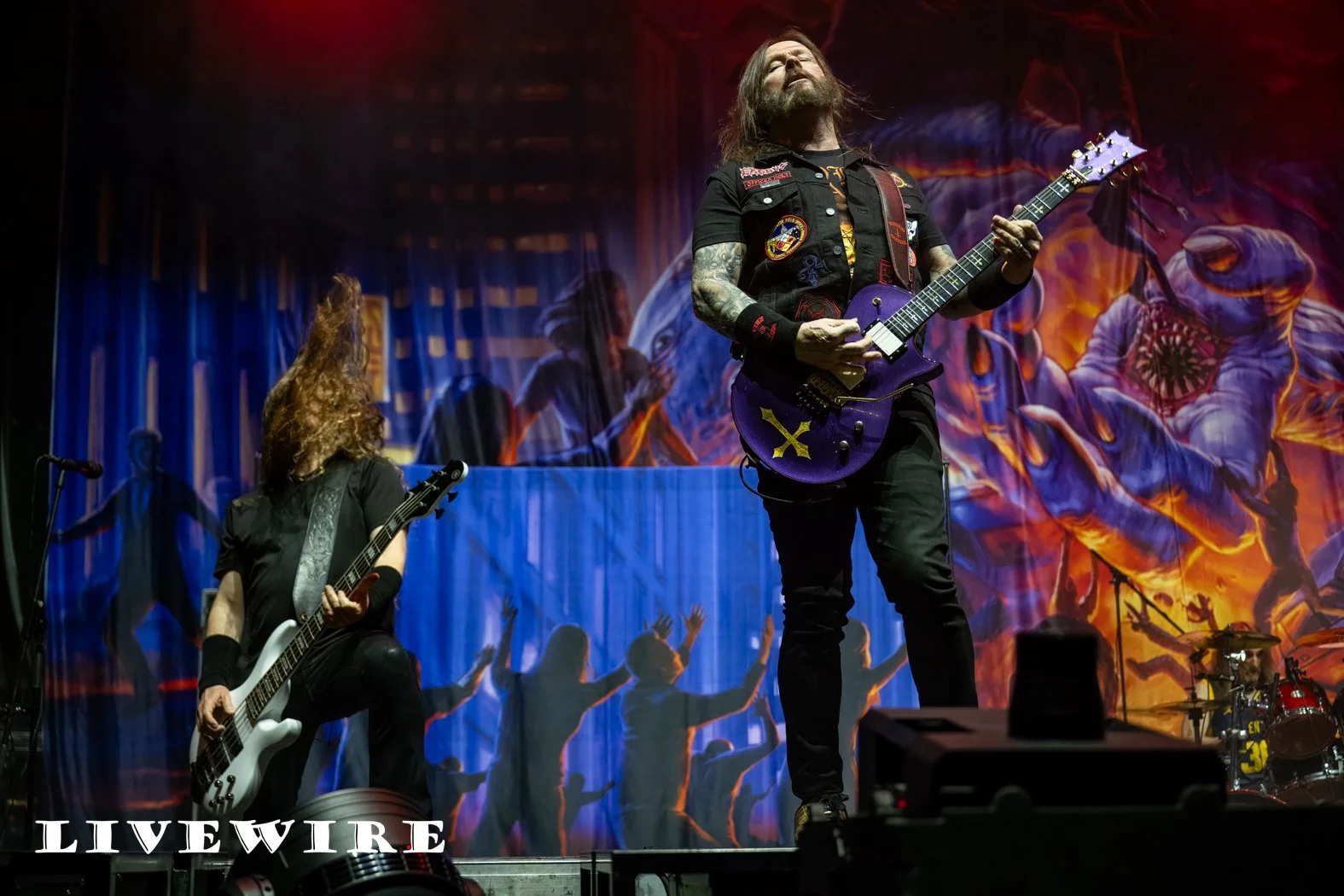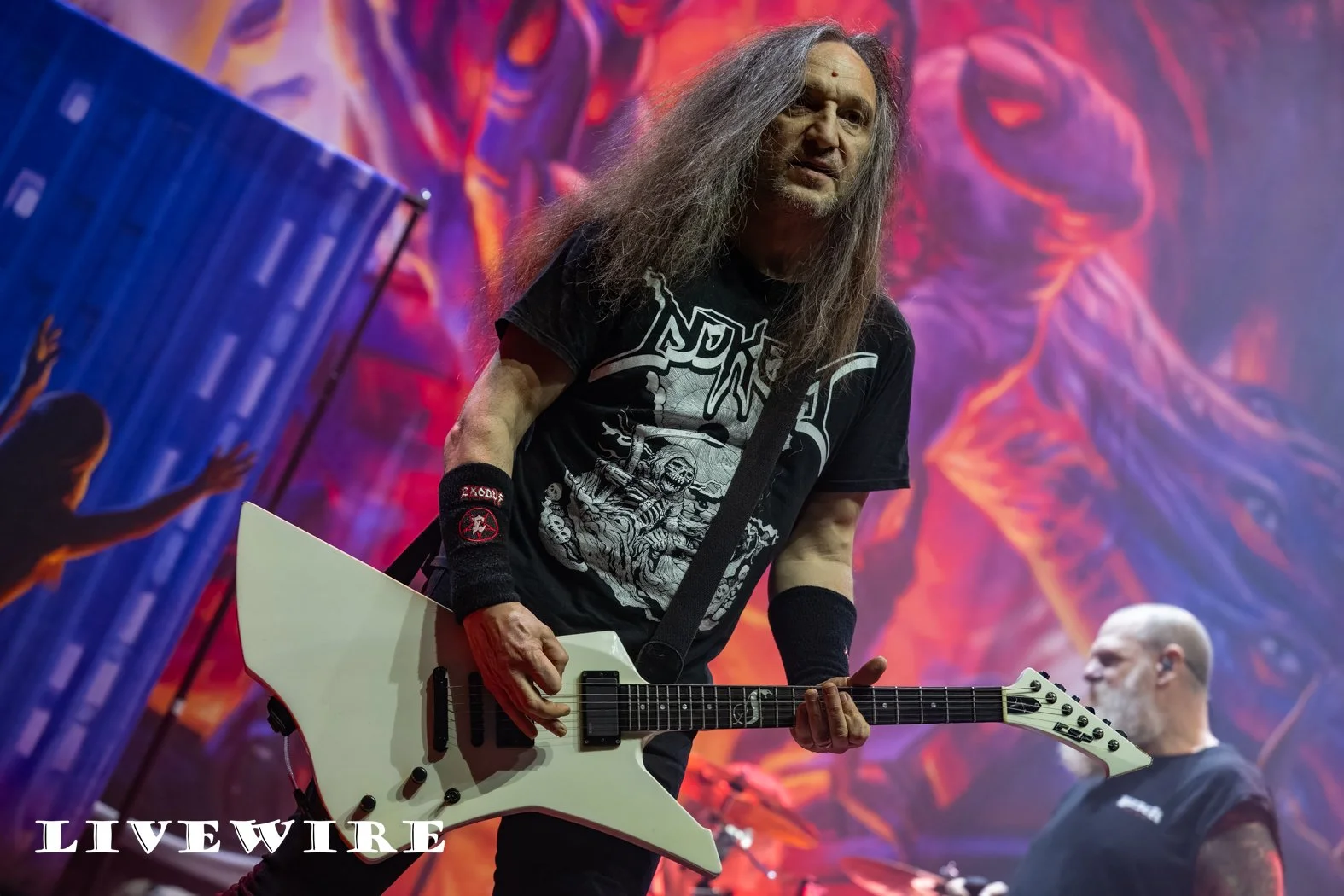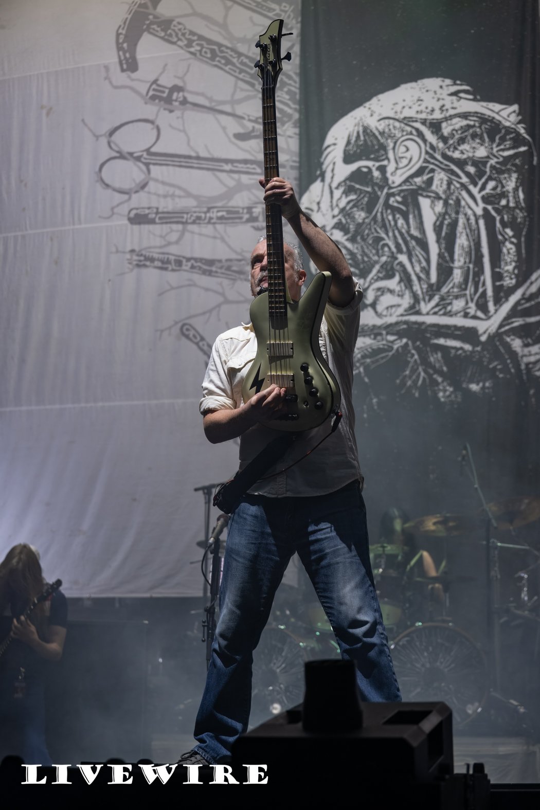 The crowd stomp along to the beat of Queen’s iconic We Will Rock You signally the imminent arrival of Exodus to the stage before the recognisable riffs of 3111 right off the new album “Goliath” blast out at us. Gary Holt shows no sign of slowing down, as he delivers riff after riff, still in his iconic battle jacket and sporting a big grin. Rob is also clearly loving the experience being back in the band with gusto as in Bonded By Blood which gets howls of joy from the crowd. He winds up and interacts with the crowd at every chance, asking if there are any Manchester United fans in. When the response is muted, he admits to not knowing much about football, being a hockey fan (Go Rangers he yells !)