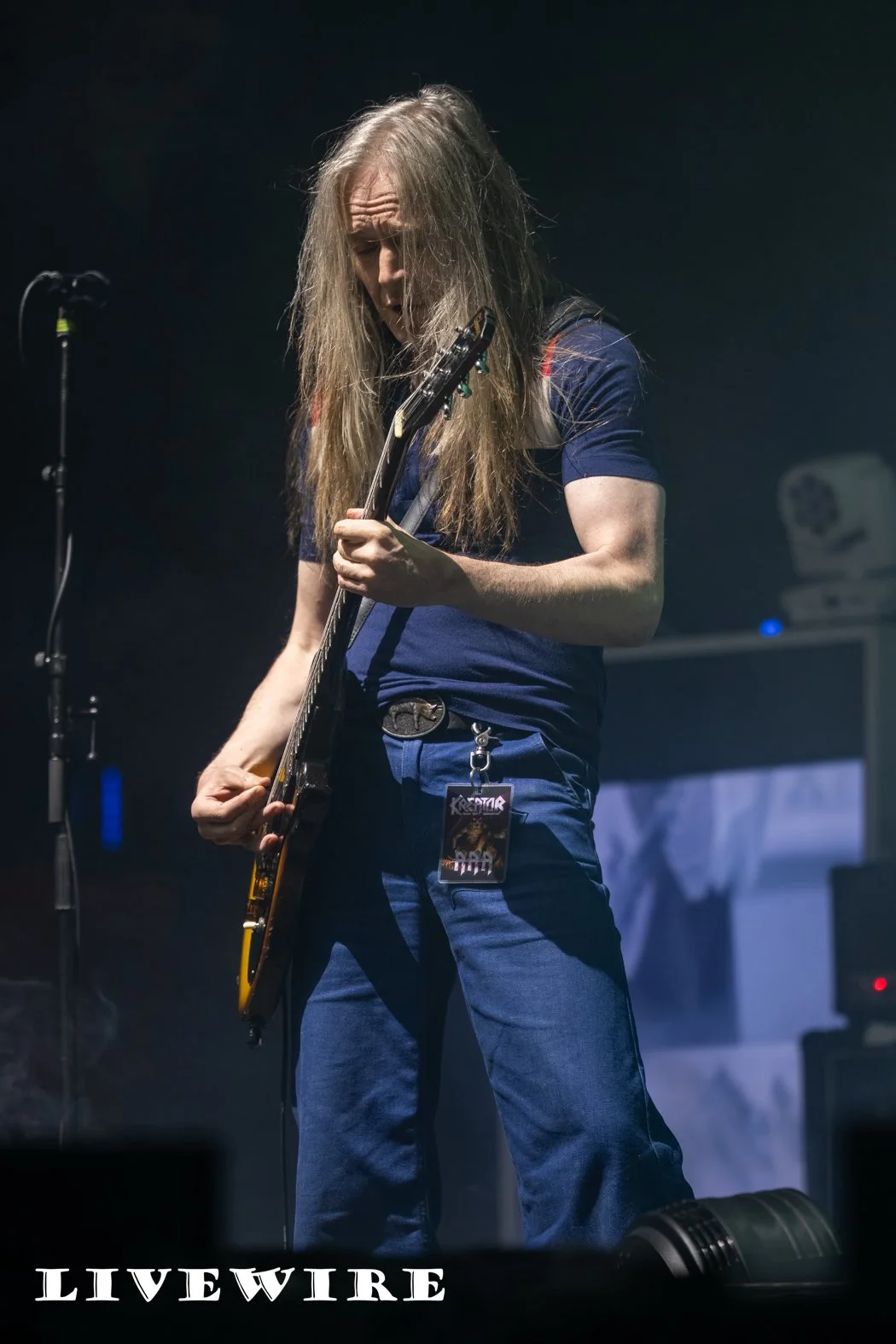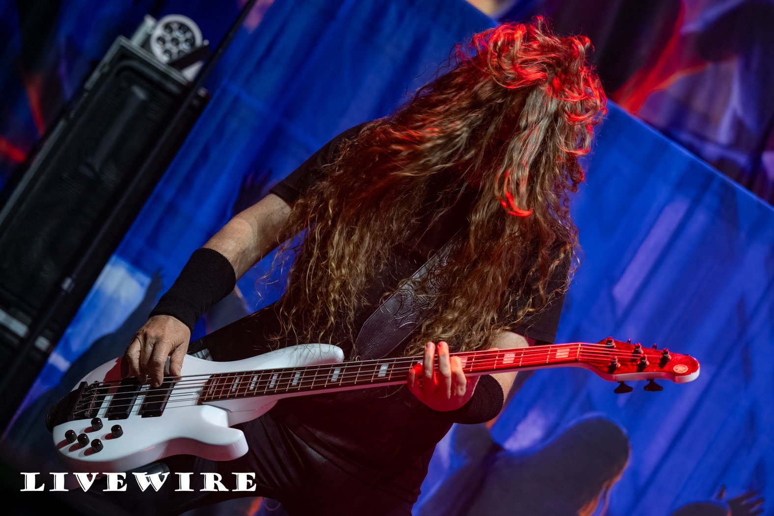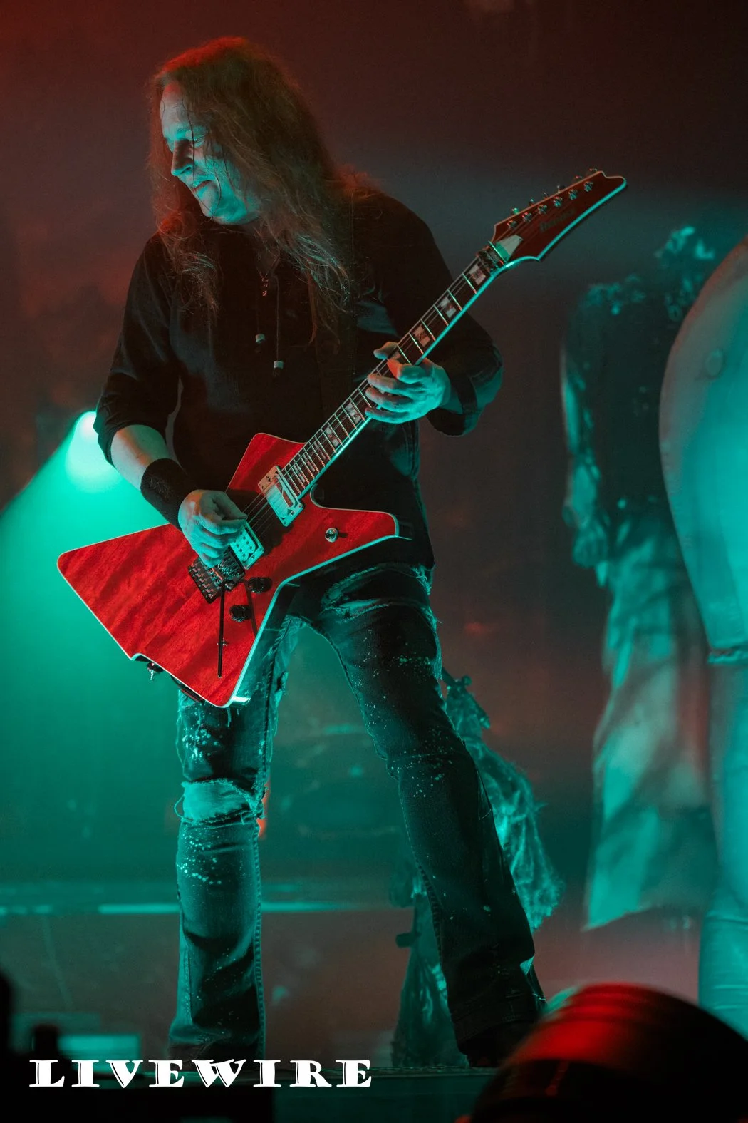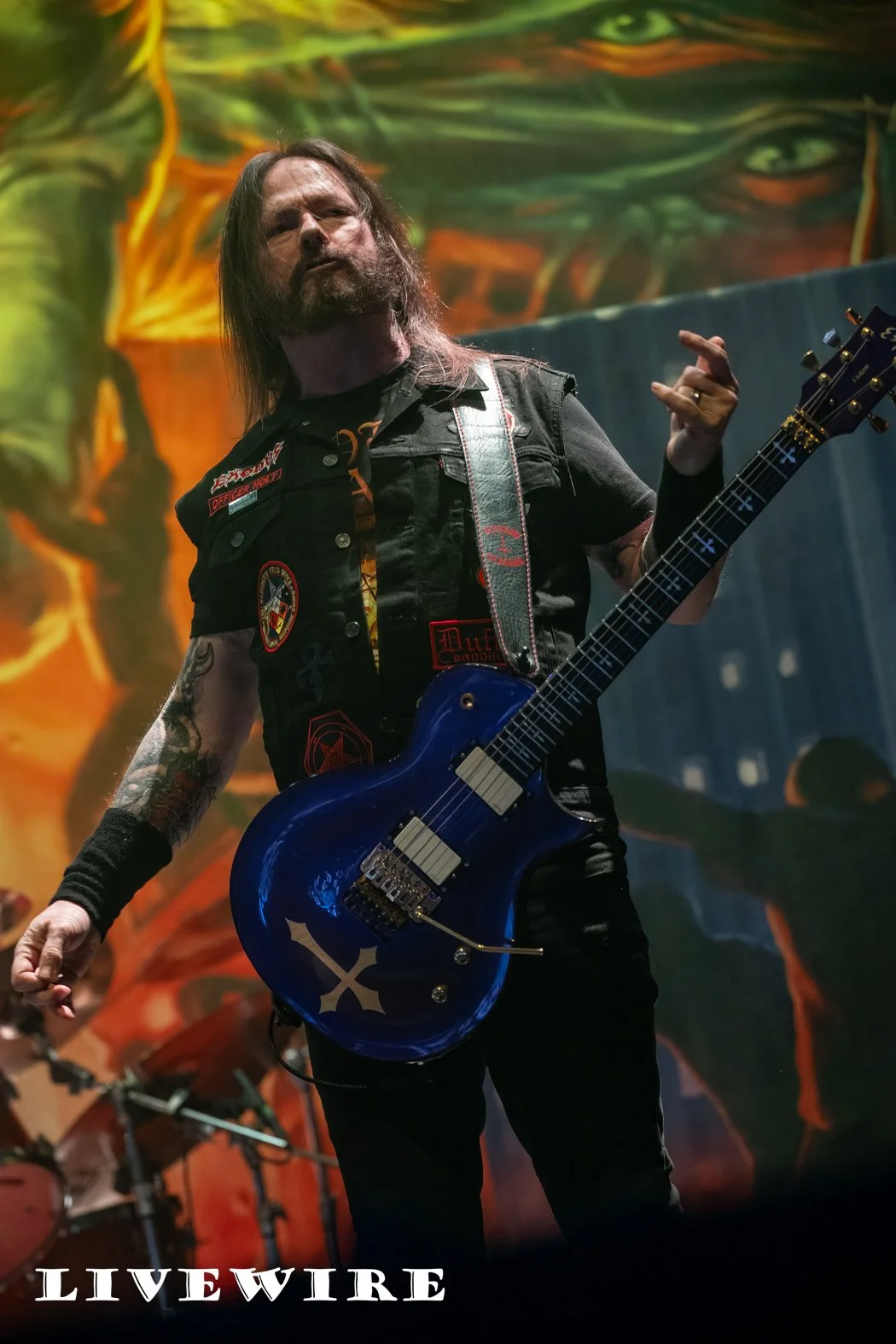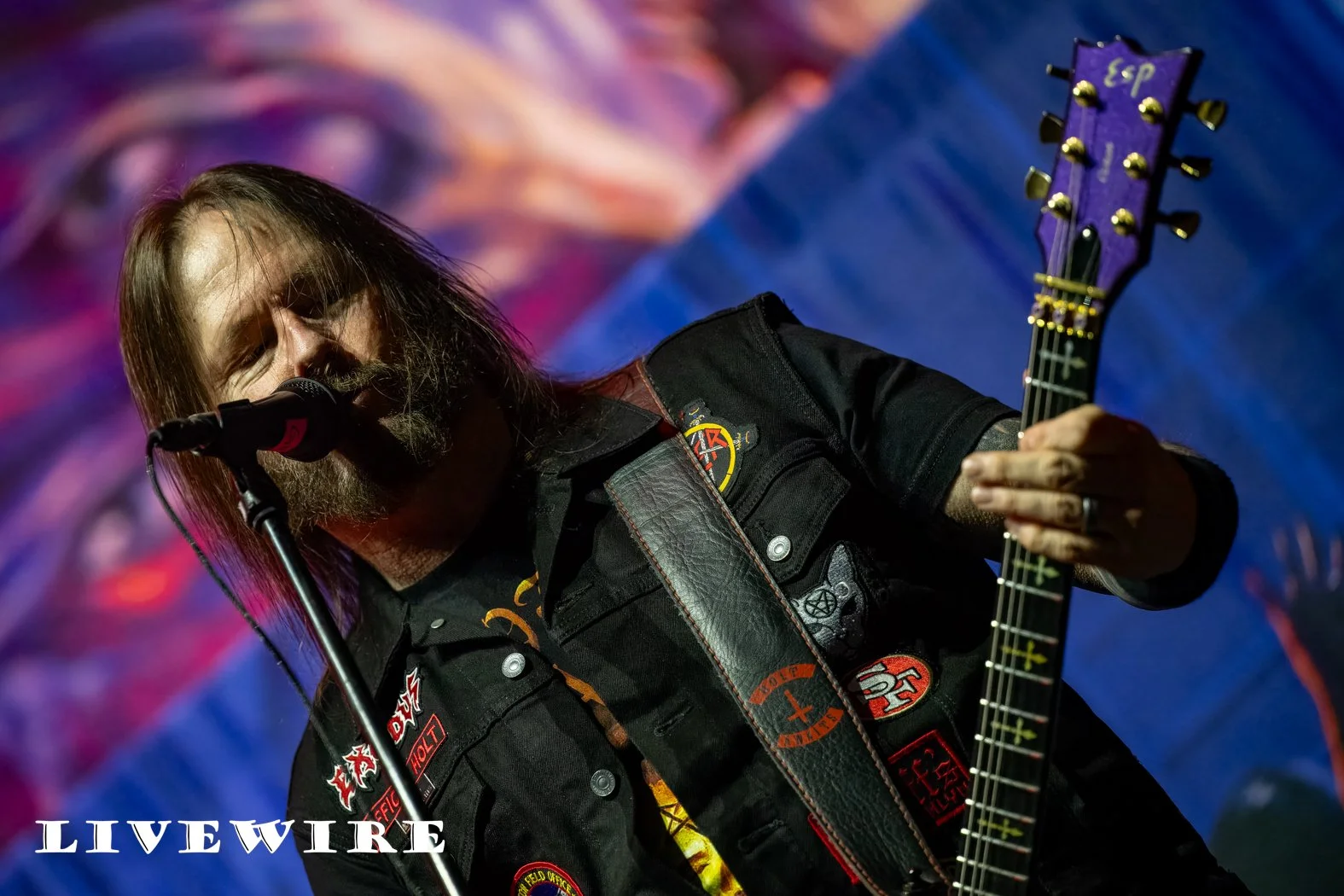 The crowd stomp along to the beat of Queen’s iconic We Will Rock You signally the imminent arrival of Exodus to the stage before the recognisable riffs of 3111 right off the new album “Goliath” blast out at us. Gary Holt shows no sign of slowing down, as he delivers riff after riff, still in his iconic battle jacket and sporting a big grin. Rob is also clearly loving the experience being back in the band with gusto as in Bonded By Blood which gets howls of joy from the crowd. He winds up and interacts with the crowd at every chance, asking if there are any Manchester United fans in. When the response is muted, he admits to not knowing much about football, being a hockey fan (Go Rangers he yells !)