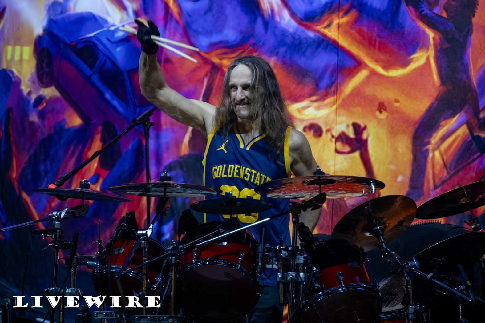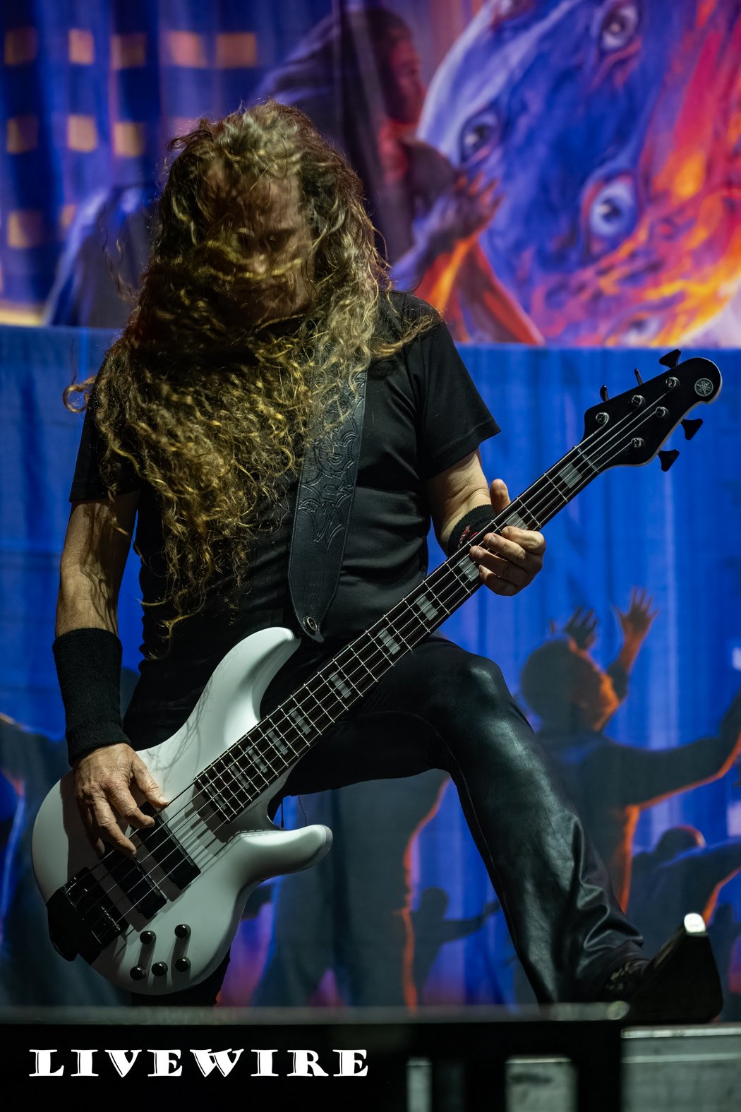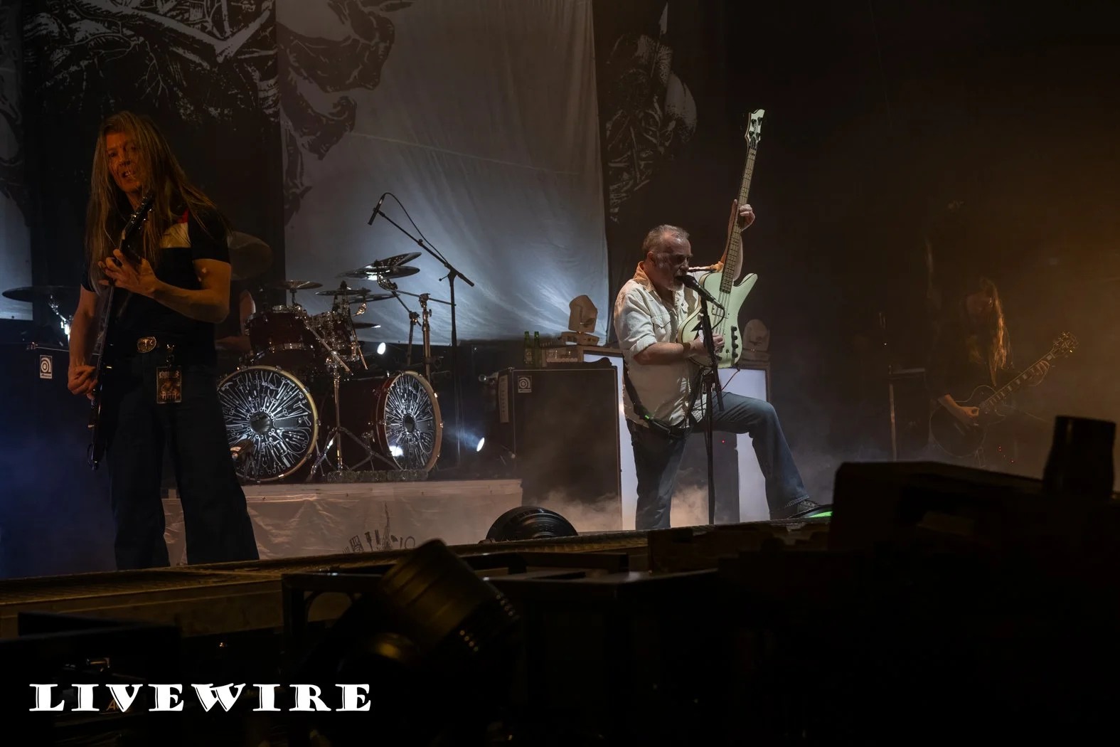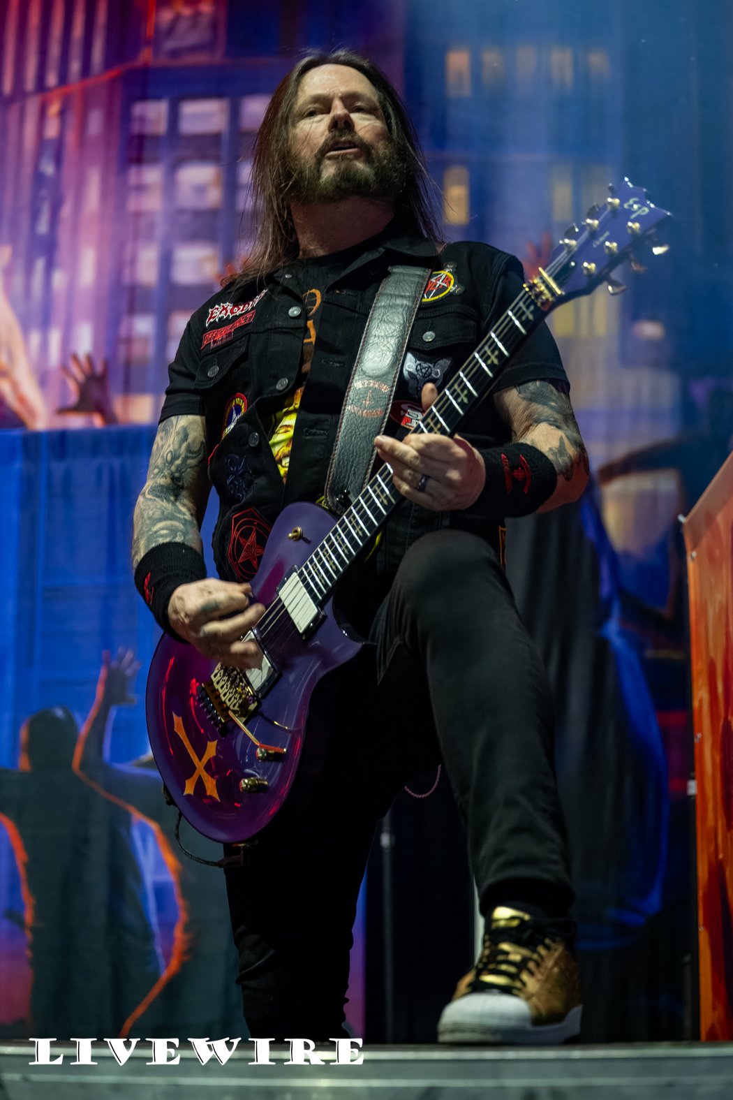 The crowd stomp along to the beat of Queen’s iconic We Will Rock You signally the imminent arrival of Exodus to the stage before the recognisable riffs of 3111 right off the new album “Goliath” blast out at us. Gary Holt shows no sign of slowing down, as he delivers riff after riff, still in his iconic battle jacket and sporting a big grin. Rob is also clearly loving the experience being back in the band with gusto as in Bonded By Blood which gets howls of joy from the crowd. He winds up and interacts with the crowd at every chance, asking if there are any Manchester United fans in. When the response is muted, he admits to not knowing much about football, being a hockey fan (Go Rangers he yells !)