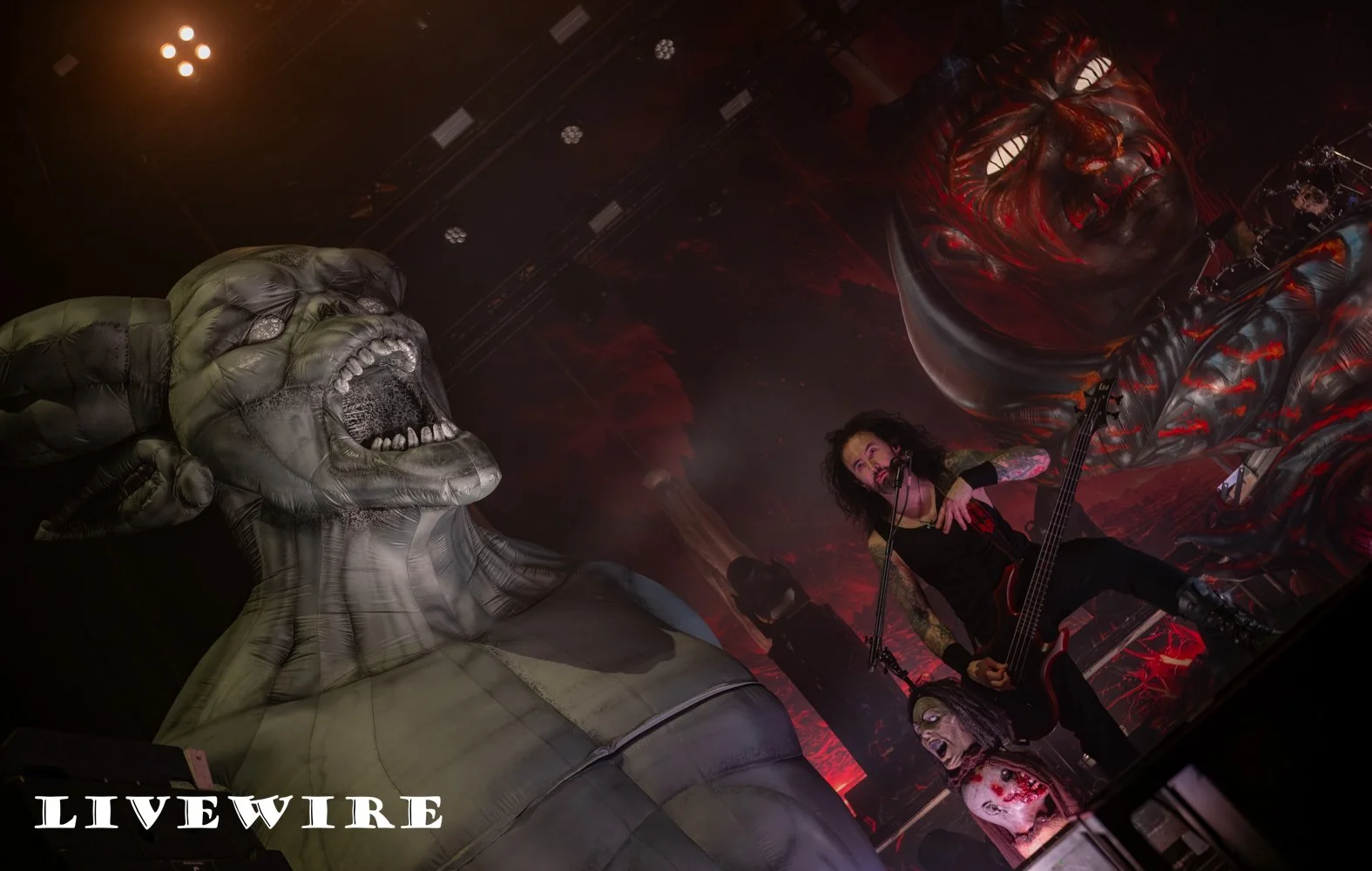 As Maiden’s Run To The Hills blasts through the PA a video is projected on to the giant white screen before the sheet drops to cries from the crowd. The stage is brilliantly set, with giant inflated demons either side of the stage, and the drums on a riser behind another huge horned demon. Kreator are masters of their craft, not just musically, but theatrically too. Almost all the tracks are accompanied by smoke and pyros, that war the face and cast a fiery, hellish glow across the crowd. Amongst all this Frédéric and Sami stomp around the stage, swapping places and pulling poses with feet planted on the monitors, both waving and encouraging the crowd to shout and cheer at every opportunity.