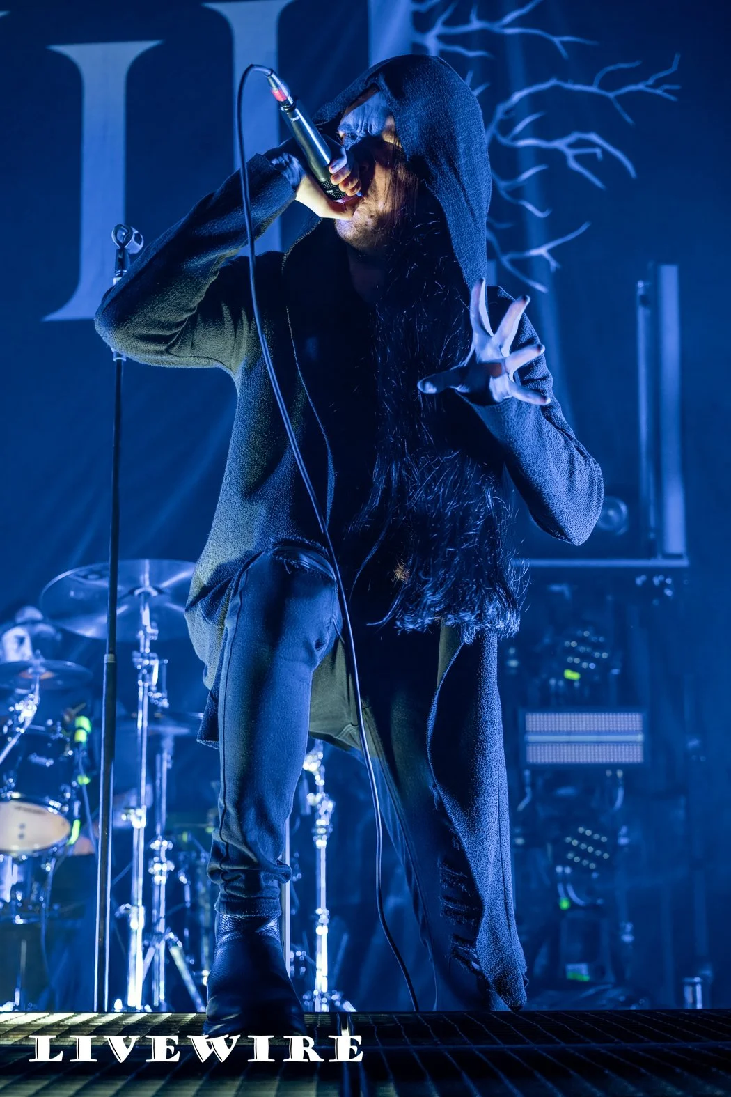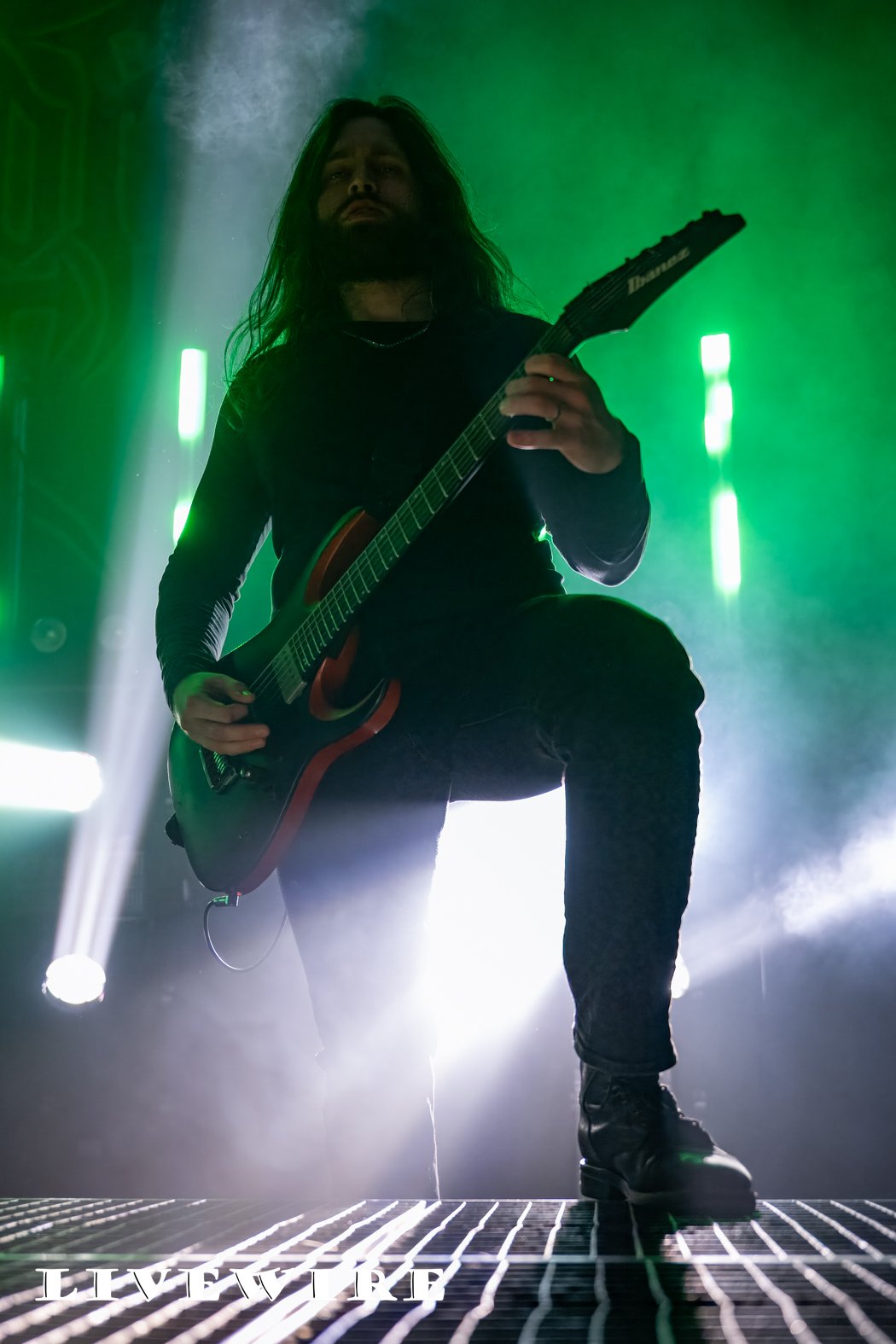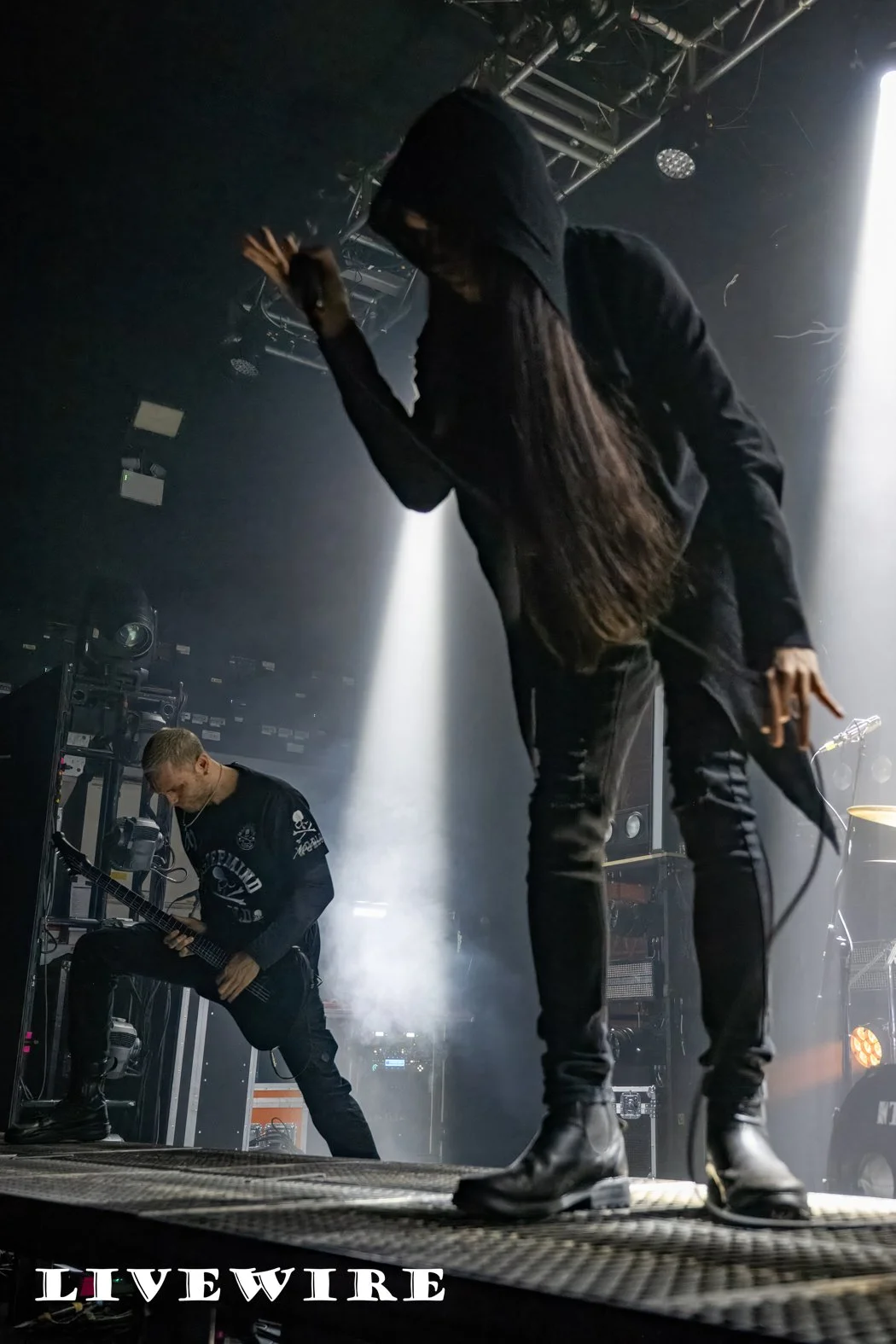 And what a start to the night this was ! Humanity’s Last Breathe are not about speed, it’s doom laden, dark and heavy that immerses you in the depth of their sound. Filip, dressed in a long hooded robe, long dark hair also hiding his features stalks the stage menacingly as he delivers some deep dark growls. Klas on drums pulls the sound together, delivering it’s beating heart, the base of their crushing sound.