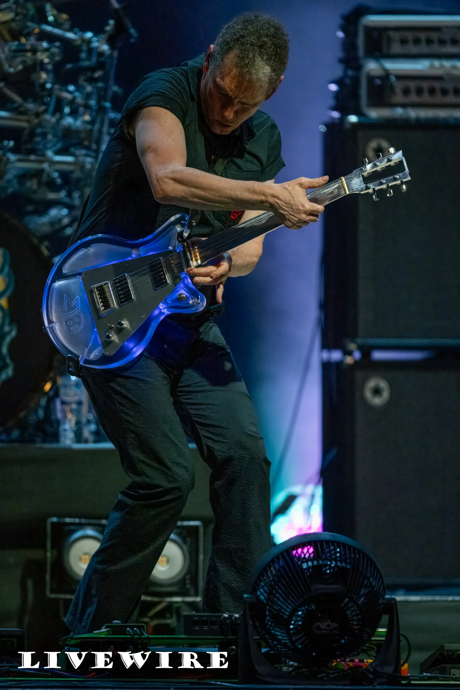 Vai’s bluesy Tender Surrender is a big hit before the stage goes dark….. something is moved out and the lights return as Vai rips the cover off The Hyrda. The crowd roar and cheer at the incredible beast of a guitar before them. With three necks and four sets of strings Vai takes centre stage as be plays Teeth Of The Hydra. Technically impressive, a show stopper that shows off his skills to perfection. Joe returns and the mood changes with a barnstormin’ version of his classic Satch Boogie.
