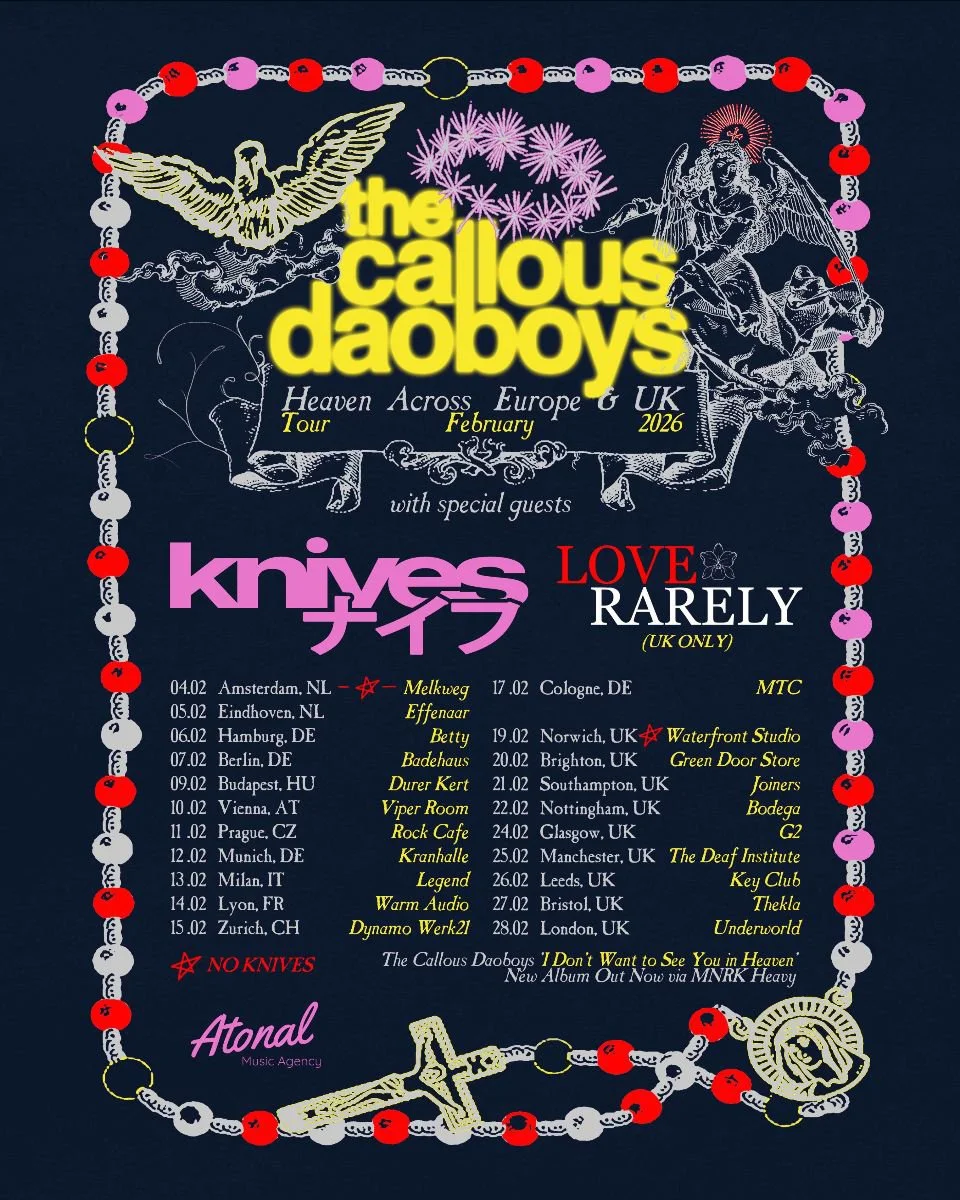 The run will see support from Knives throughout, with rising UK outfit Love Rarely joining the bill for the UK dates. Marking their most ambitious overseas trek to date, the tour promises unrelenting energy, unpredictable performances, and a powerful statement of The Callous Daoboys’ ever-growing global presence.