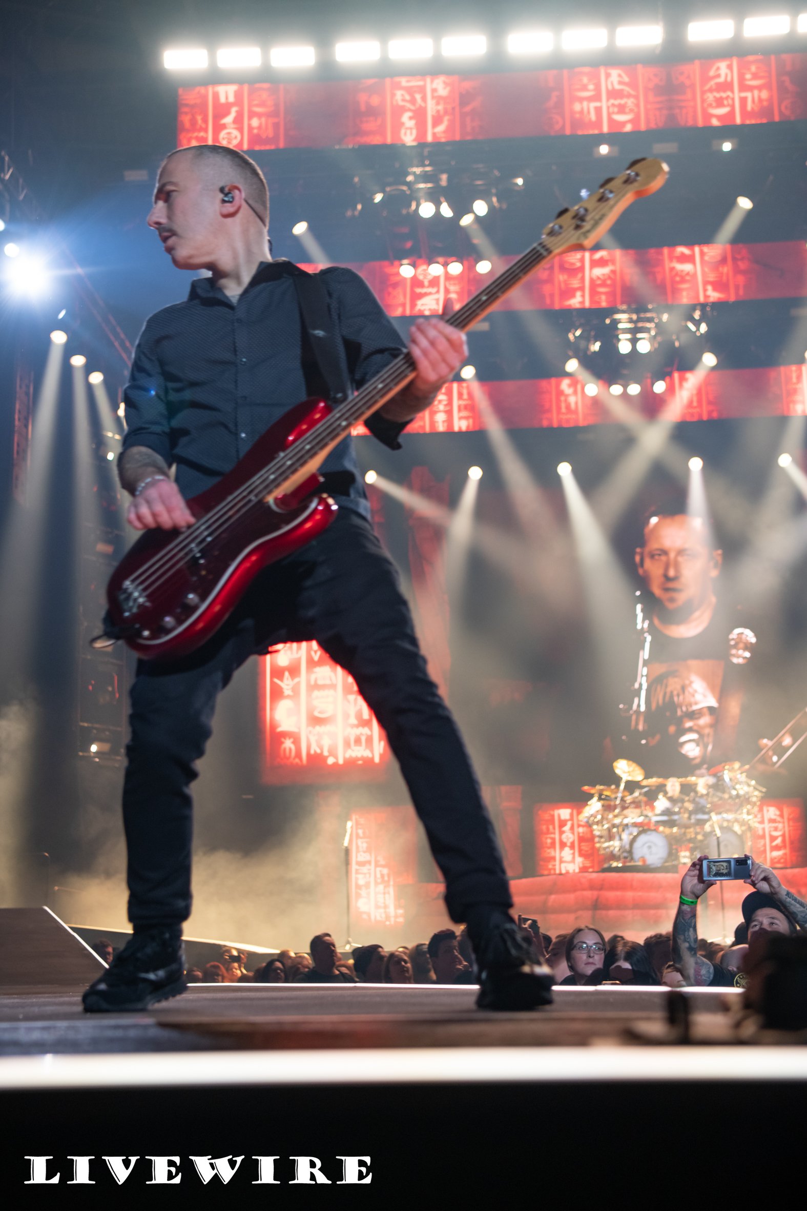 Another track from “Seal the Deal” and the crowd light up the phone torches as For Evigt (Forever) starts, a beautiful moment. Volbeat aren’t your usual metal band, and have a wide range of influences from rock and metal through rockabilly and good old rock and roll, and this really shows in their material which has a broad range of styles. Seal the Deal has a full on heavy introduction to which the crowd enthusiastically clap along to as Poulsen, Caggiano and Larsen strut round the walkway.
